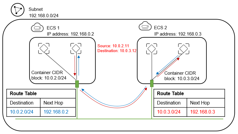 10.0.2.0/24, and that on ECS 2 is10.0.3.0/24. - The next hop of the data packets sent to a container is the ECS where the container is deployed. As shown in the following figure, the next hop of the packets sent to CIDR block