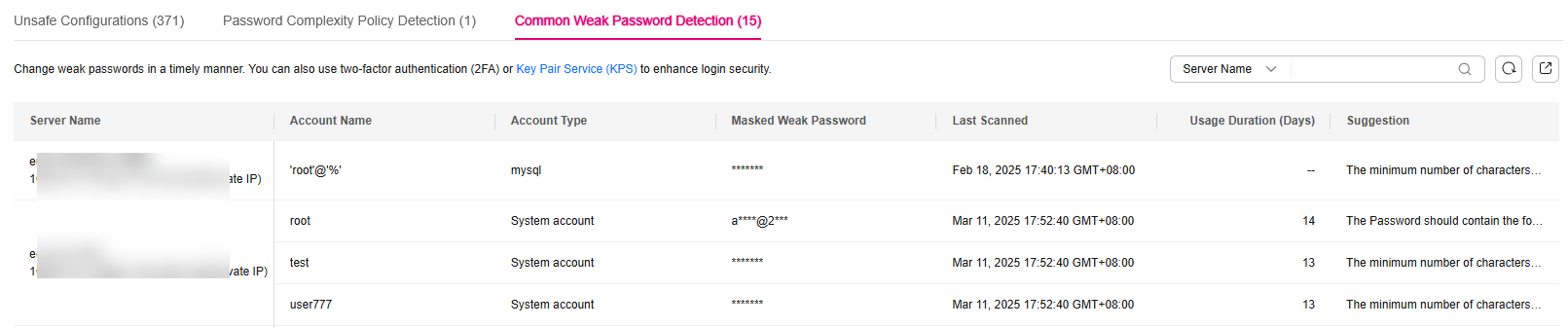 HSS automatically scans servers every early morning for common weak passwords and the passwords you banned. You can then ask the weak password users to set stronger passwords. HSS can detect weak passwords in SSH, FTP, and MySQL.