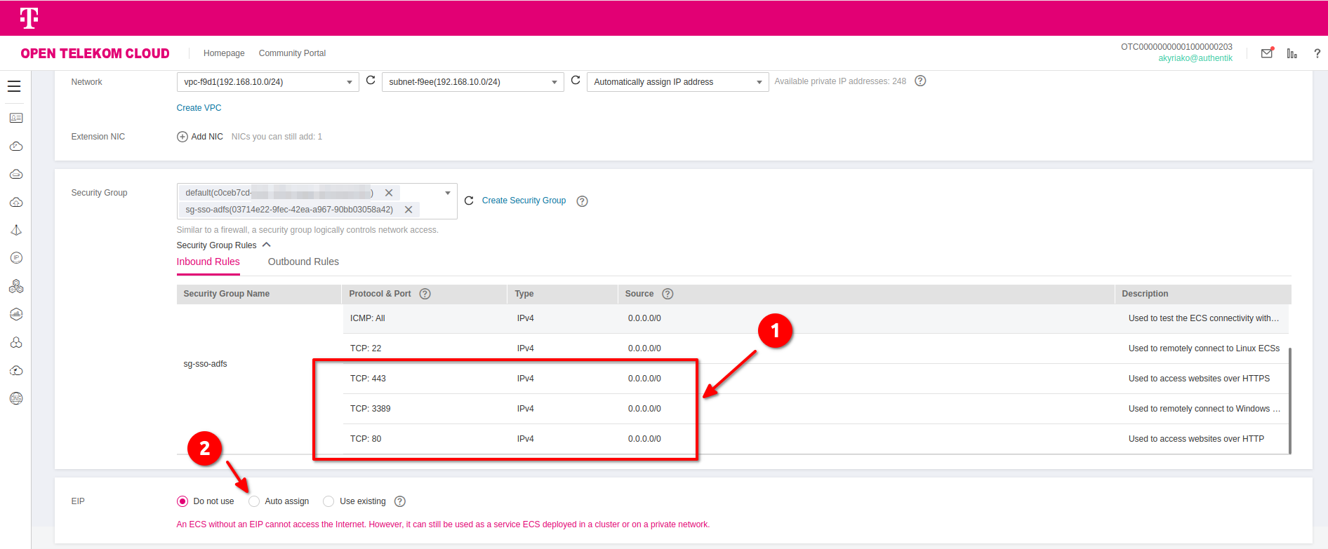 When integrating AD FS as an Identity Provider (IdP) within your Open Telekom Cloud tenant—it is essential that the Elastic IP (EIP) assigned to your ECS Server resolves to a valid and secure FQDN. This means the public DNS entry must point to the EIP and be backed by a properly issued TLS certificate.