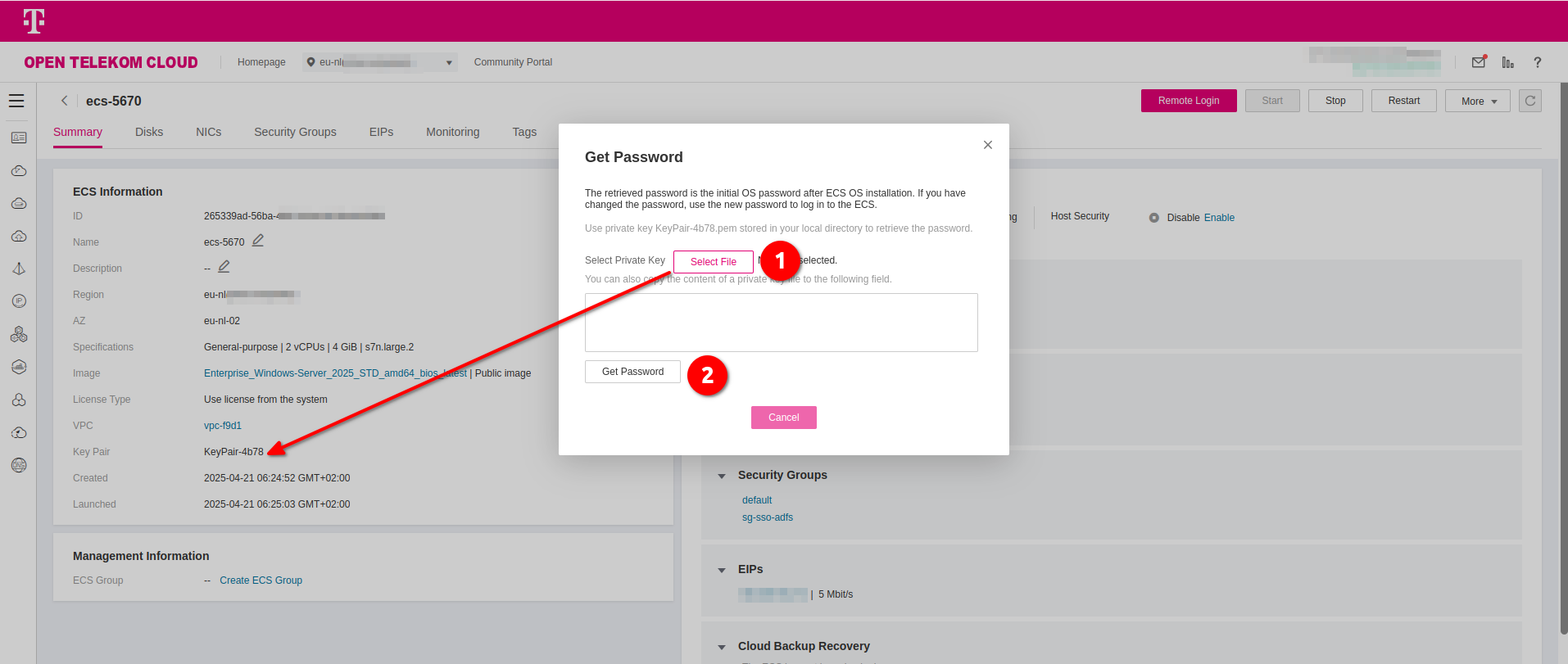 Complete the wizard and deploy the ECS instance. Once the deployment completes, return the Elastic Cloud Server, enter your ECS instance and click More -> Get Password. Click Select File to select the Key Pair you used during the installation and click Get Password in order to get the credentials for the local Administrator account.