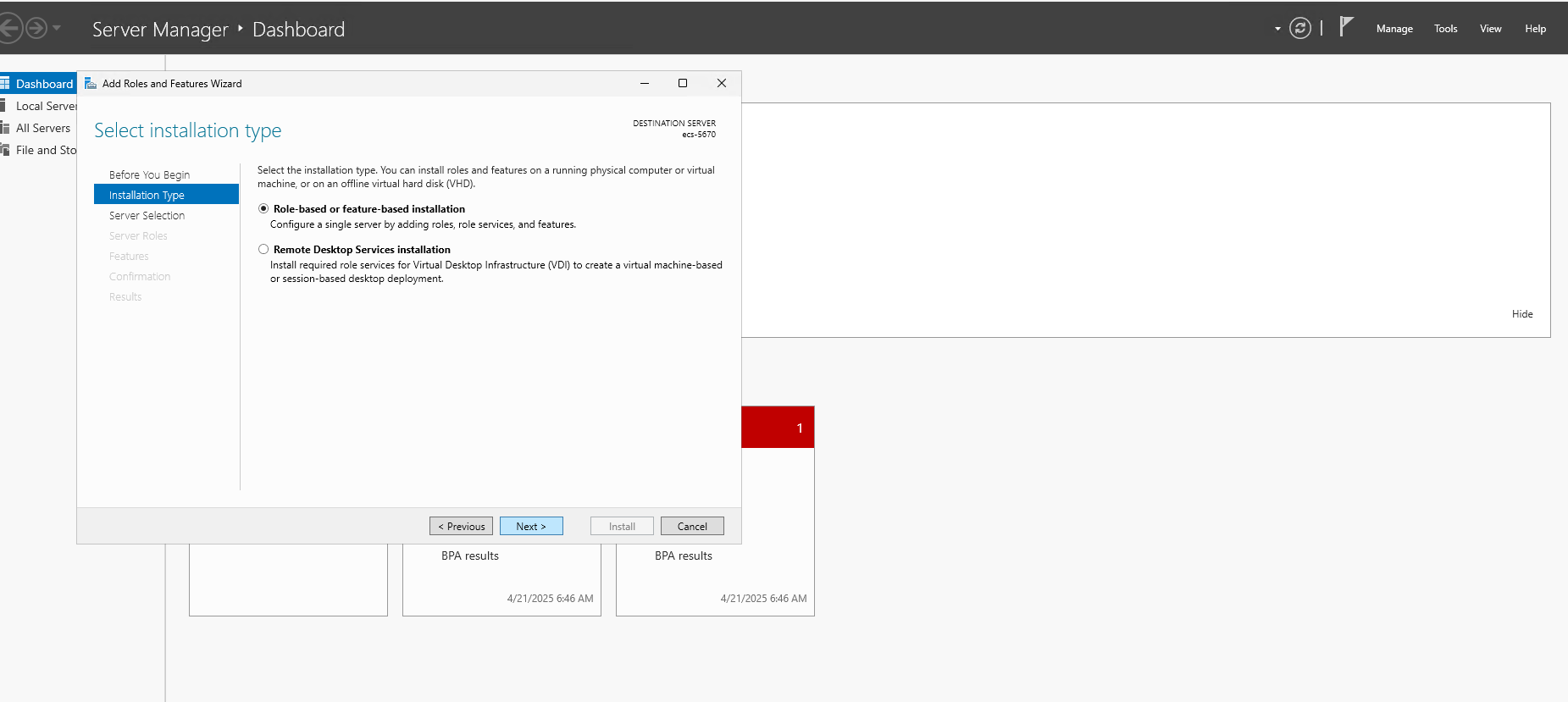 - Select "Role-based or feature-based installation" and choose the ECS Server from the Server Pool.