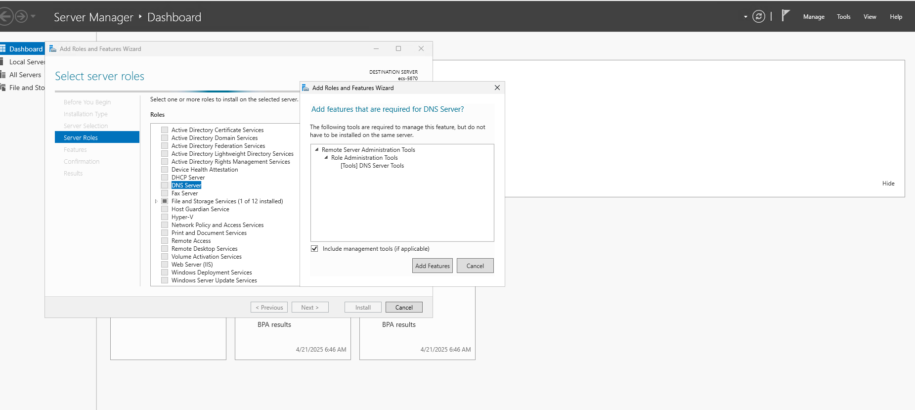- Under Server Roles, check "Active Directory Domain Services" and "DNS Server"