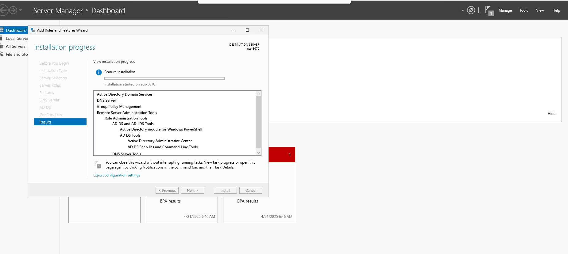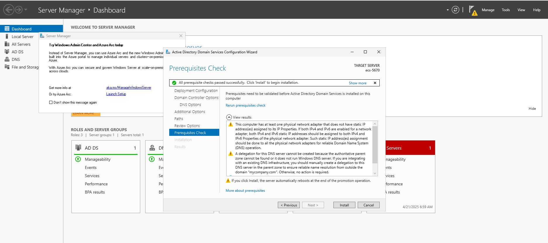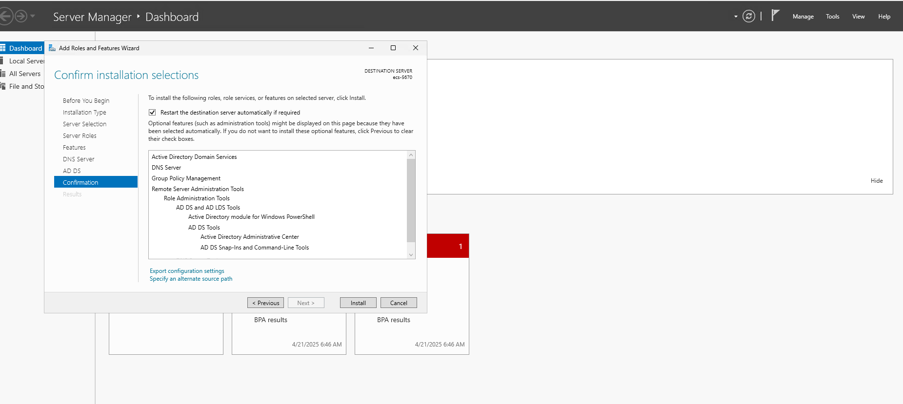 - Review prerequisites, then click Install. The server will reboot when promotion finishes.