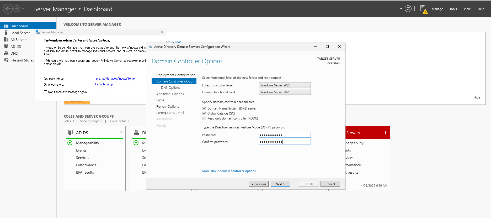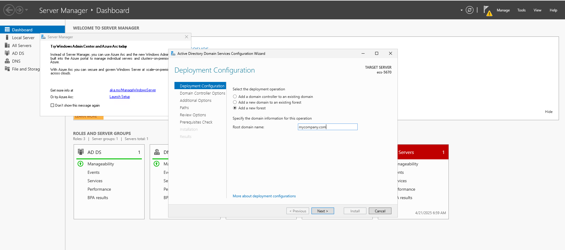 mycompany.comas domain name . - Specify a Directory Services Restore Mode (DSRM) password.