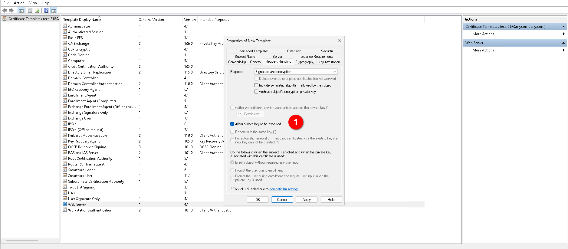 - Click on the link "More information is required to enroll for this certificate. Click here to configure settings." under your certificate template.