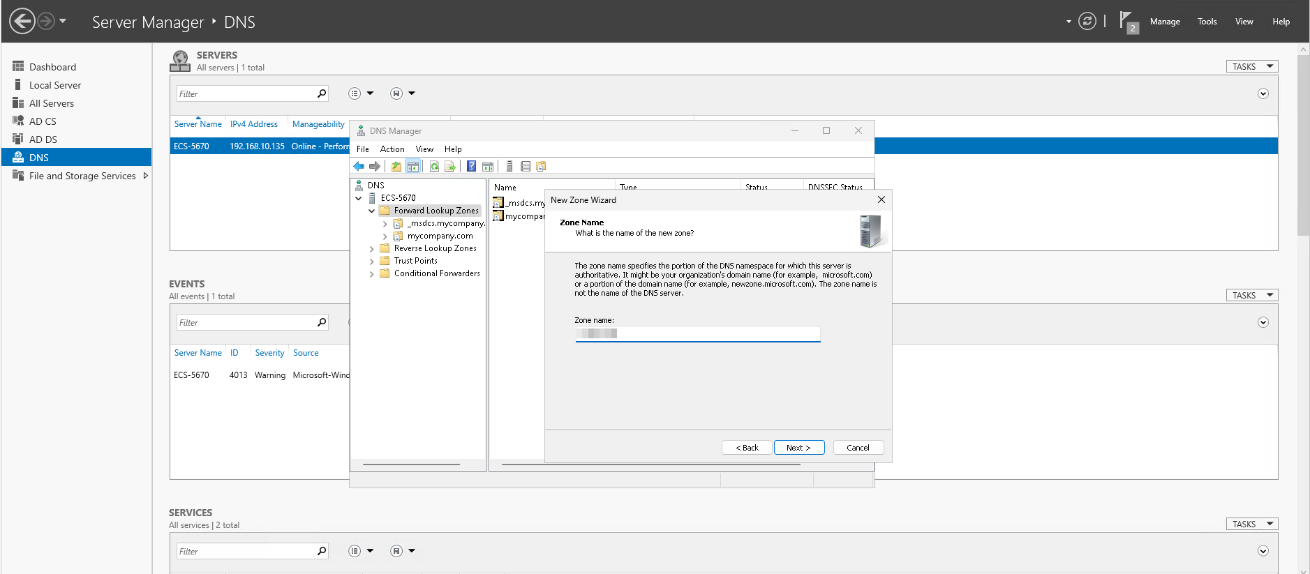 - Expand the tree and right-click Forward Lookup Zones -> New Zone and click Next.