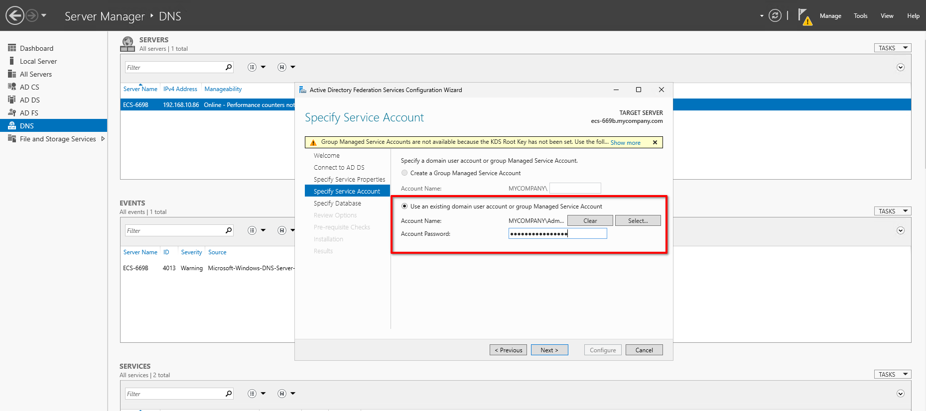 MYCOMPANY\Administratoras the Account Name under "Use an existing domain user account or group Managed Service Account" and click Next.warningIn production environments you should use a Service Account.