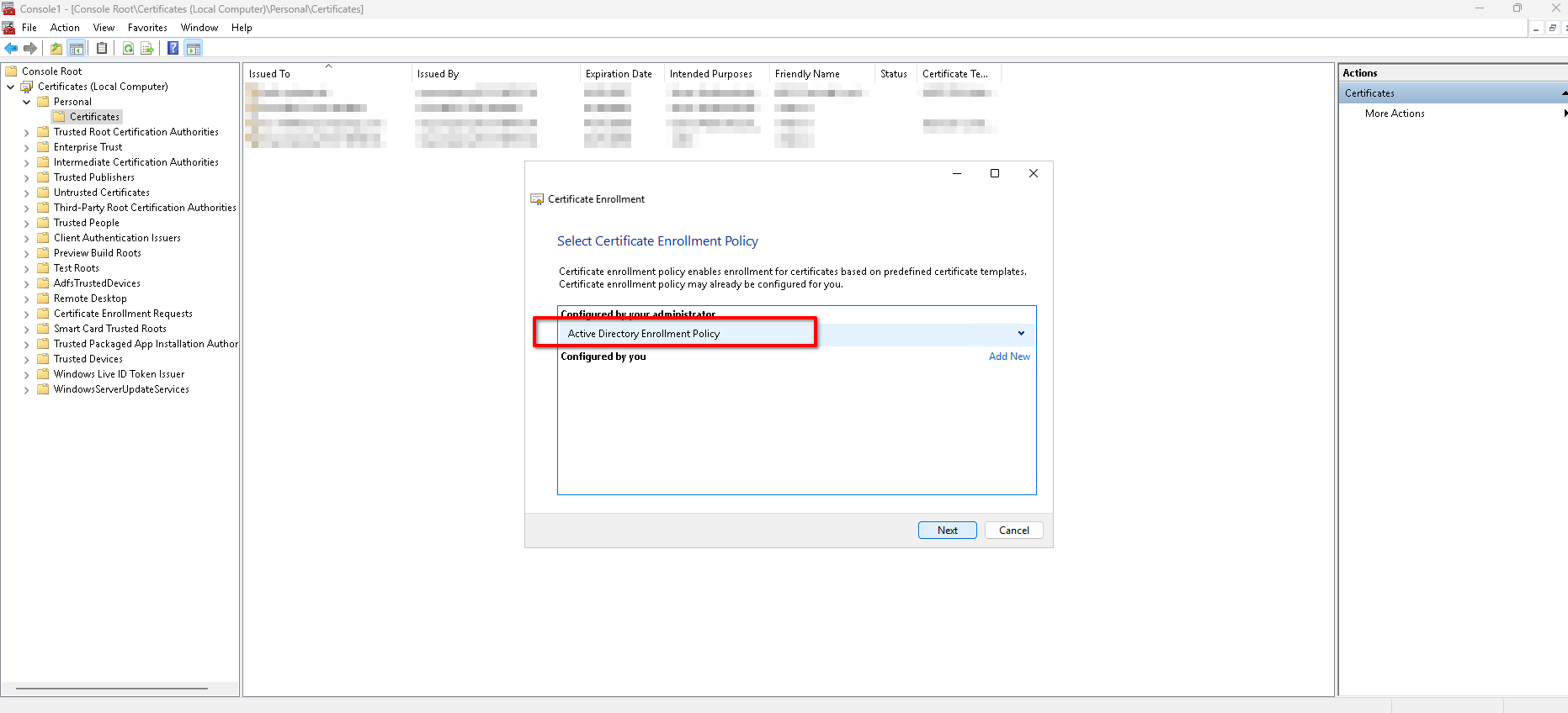 - Select "Active Directory Enrollment Policy" as Certificate Enrollment Policy and click Next.
